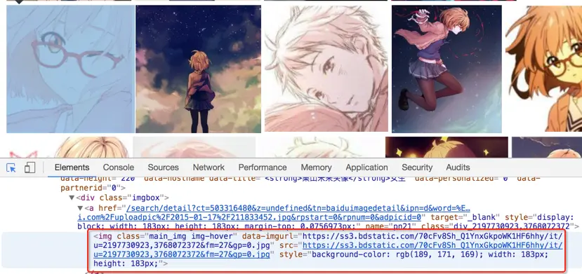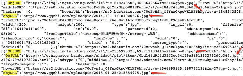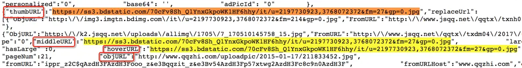通过分析可以知道,前面两个是缩小的版本,hoverURL 是鼠标移动过后显示的版本,objURL 应该是我们需要的,可以分别打开这几个网址看看,发现 objURL 的那个最大最清晰。