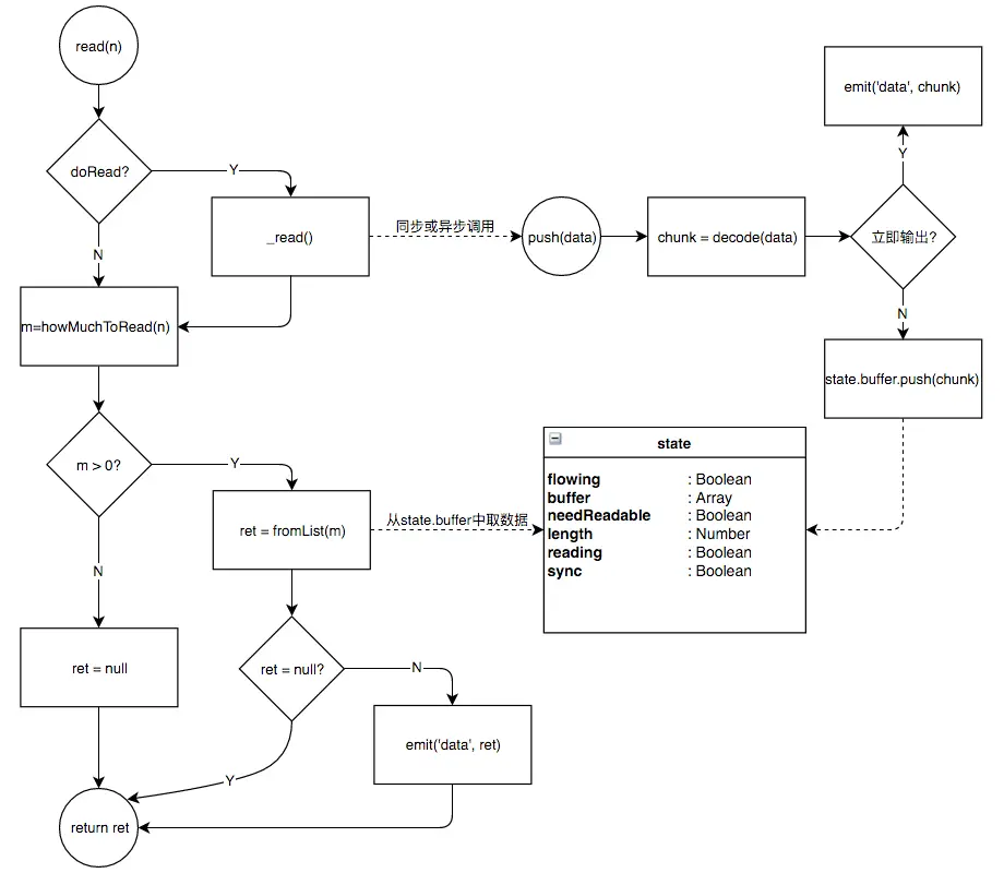 消耗方调用read(n)促使流输出数据,而流通过_read()使底层调用push方法将数据传给流。 如果调用push方法时缓存为空,则当前数据即为下一个需要的数据。 这个数据可能先添加到缓存中,也可能直接输出。 执行read方法时,在调用_read后,如果从缓存中取到了数据,就以data事件输出。