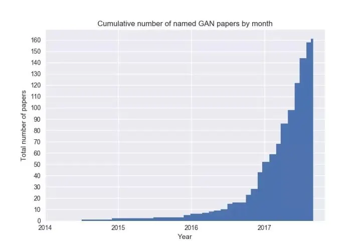 生成对抗网络(Generative Adversarial Net,GAN)是近年来深度学习中一个十分热门的方向,卷积网络之父、深度学习元老级人物 LeCun Yan 就曾说过“GAN is the most interesting idea in the last 10 years in machine learning”。尤其是近两年,GAN 的论文呈现井喷的趋势,GitHub 上有人收集了各种各样的 GAN 变种、应用、研究论文等,其中有名称的多达数百篇。作者还统计了 GAN 论文发表数目随时间变化的趋势,如图 7-1 所示,足见 GAN 的火爆程度。