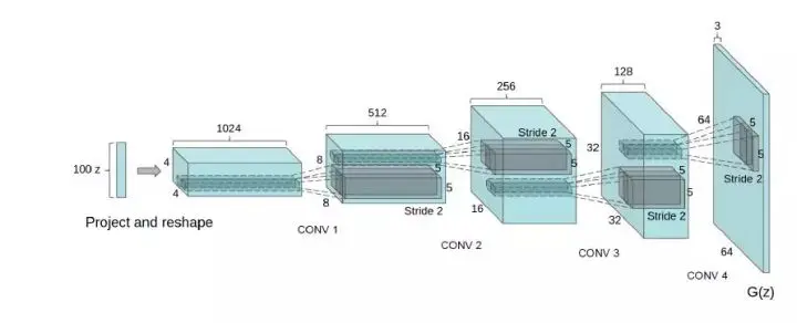 下面我们来思考网络结构的设计。判别器的目标是判断输入的图片是真迹还是赝品,所以可以看成是一个二分类网络,参考第 6 章中 Dog vs. Cat 的实验,我们可以设计一个简单的卷积网络。生成器的目标是从噪声中生成一张彩色图片,这里我们采用广泛使用的 DCGAN(Deep Convolutional Generative Adversarial Networks)结构,即采用全卷积网络,其结构如图 7-7 所示。网络的输入是一个 100 维的噪声,输出是一个 3×64×64 的图片。这里的输入可以看成是一个 100×1×1 的图片,通过上卷积慢慢增大为 4×4、8×8、16×16、32×32 和 64×64。上卷积,或称转置卷积,是一种特殊的卷积操作,类似于卷积操作的逆运算。当卷积的 stride 为 2 时,输出相比输入会下采样到一半的尺寸;而当上卷积的 stride 为 2 时,输出会上采样到输入的两倍尺寸。这种上采样的做法可以理解为图片的信息保存于 100 个向量之中,神经网络根据这 100 个向量描述的信息,前几步的上采样先勾勒出轮廓、色调等基础信息,后几步上采样慢慢完善细节。网络越深,细节越详细。