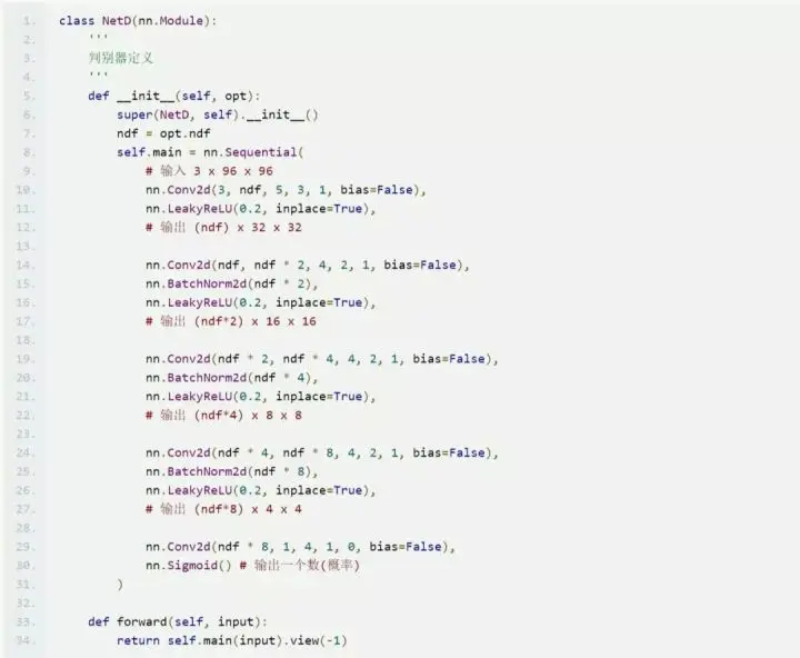 可以看出生成器的搭建相对比较简单,直接使用 nn.Sequential 将上卷积、激活、池化等操作拼接起来即可,这里需要注意上卷积 ConvTransposed2d 的使用。当 kernel size 为 4、stride 为 2、padding 为 1 时,根据公式 H_out=(H_in-1)*stride-2*padding+kernel_size,输出尺寸刚好变成输入的两倍。最后一层采用 kernel size 为 5、stride 为 3、padding 为 1,是为了将 32×32 上采样到 96×96,这是本例中图片的尺寸,与论文中 64×64 的尺寸不一样。最后一层用 Tanh 将输出图片的像素归一化至 -1~1,如果希望归一化至 0~1,则需使用 Sigmoid。接着我们来看判别器的网络结构。