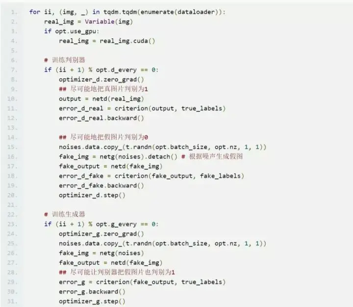 - 对于假图片,在训练判别器时,我们希望它输出为 0;而在训练生成器时,我们希望它输出为 1。因此可以看到一对看似矛盾的代码:error_d_fake = criterion(fake_output, fake_labels) 和 error_g = criterion(fake_output, true_labels)。其实这也很好理解,判别器希望能够把假图片判别为 fake_label,而生成器则希望能把它判别为 true_label,判别器和生成器互相对抗提升。