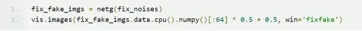 接下来就是一些可视化的代码。每次可视化使用的噪声都是固定的 fix_noises,因为这样便于我们比较对于相同的输入,生成器生成的图片是如何一步步提升的。另外,由于我们对输入的图片进行了归一化处理(-1~1),在可视化时则需要将它还原成原来的 scale(0~1) 。