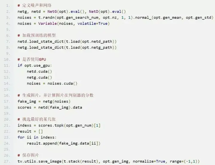除此之外,还提供了一个函数,能加载预训练好的模型,并利用噪声随机生成图片。