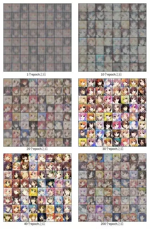 实验结果如图 7-9 所示,分别是训练 1 个、10 个、20 个、30 个、40 个、200 个 epoch 之后神经网络生成的动漫头像。需要注意的是,每次生成器输入的噪声都是一样的,所以我们可以对比在相同的输入下,生成图片的质量是如何慢慢改善的。