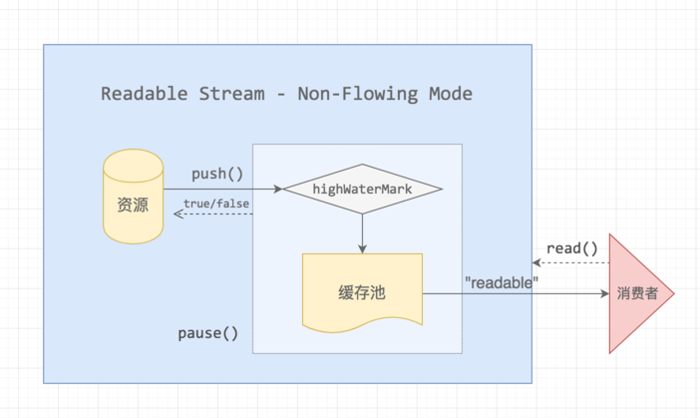 - readable._readableState.flowing = null 目前没有数据消费者,所以不会从资源库中读取数据