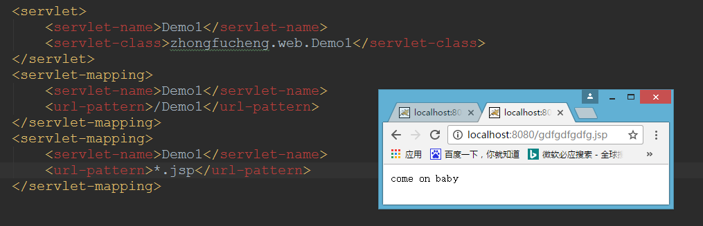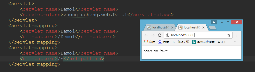 - 现在我自己配置一个缺省Servlet,Demo1就是我手工配置的缺省Servlet,覆盖掉web.xml配置的缺省Servlet