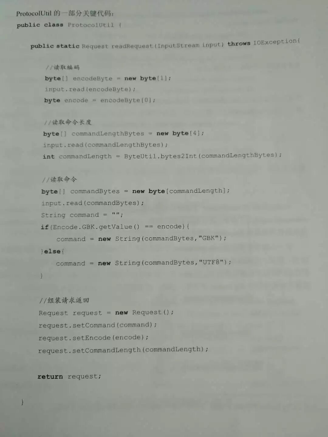 原理: 1、设计一个工具类ProtocolUtil 2、readRequest方法将从传递进来的输入流中读取请求的编码、命令和命令长度三个参数,进行相应的编码转换,并构造成Request对象返回 3、而writeResponse方法的作用则是将Response对象中的字段根据对应的编码写入输入流中。