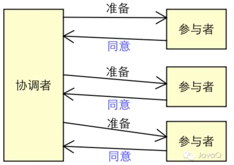 各参与者准备工作完成后,响应协调者。如果参与者的准备工作执行成功,则返回一个"同意"消息;如果参与者准备工作执行失败,则返回一个"中止"消息。