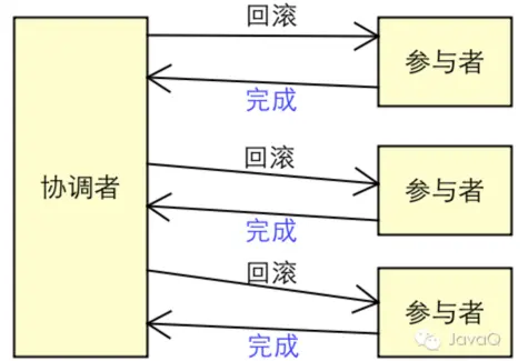 回滚完成后,参与者向协调者响应"回滚完成"消息;