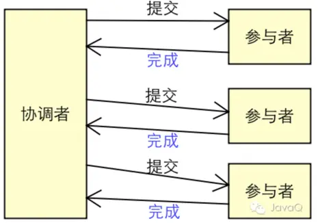 协调者收到所有参与者响应的"完成"消息后,事务完成。
