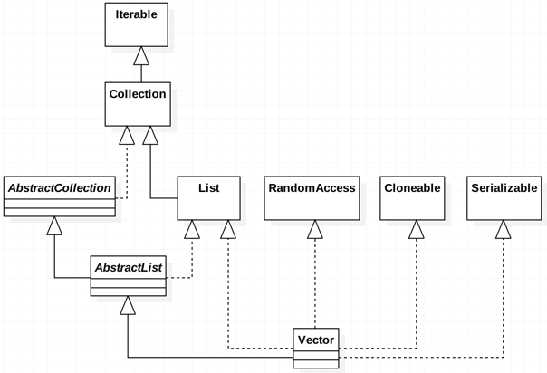 Vector实现了一个增长型的Object数组,可以包含任何类型的元素,包括null。像数组一样,它的元素可以使用下标索引值进行访问。为了容纳添加或删除后的元素,Vector的容量可以增长或收缩。每个Vector实例通过维护容量大小和容量增长因子来优化存储管理。Vector容量的大小要大于等于Vector中元素的实际个数,如果添加元素时需要扩容,则会按照增长因子的大小进行扩容。当需要添加大量的元素到Vector中,需要给它进行合适的扩容,这样可以减少增量式的内存再分配次数。像ArrayList一样,通过Vector的iterator方法和listIterator方法返回iterators时被设计成是fail-fast,当调用这两个方法的时候,如果Vector实例被从结构上进行了修改(指添加或删除一个或多个元素的操作,除了ListIterator的remove方法或add方法,或者显式调整底层数组的大小,仅仅设置元素的值不是结构上的修改),将会抛出ConcurrentModificationException,这样的设计避免了某个不确定的时间因为修改而出现的不可预知的问题。需要注意的是这个类的elements方法并不是fail-fast。Vector和ArrayList大体上的相同的,不同的是ArrayList是非同步的,而Vector是同步的,其实就是在实现的方法上使用synchronized进行同步。Vector具有同步的特性,是线程安全的,所以它的性能相对于ArrayList来说是低效的,因为同步操作需要消耗时间,针对于不需要使用线程安全的情况来说,推荐使用ArrayList代替Vector。Vector实现了RandomAccess接口可以进行快速的随机访问。Vector实现了Cloneable接口可进行clone操作。Vector实现了java.io.Serializable接口,可进行序列化操作。