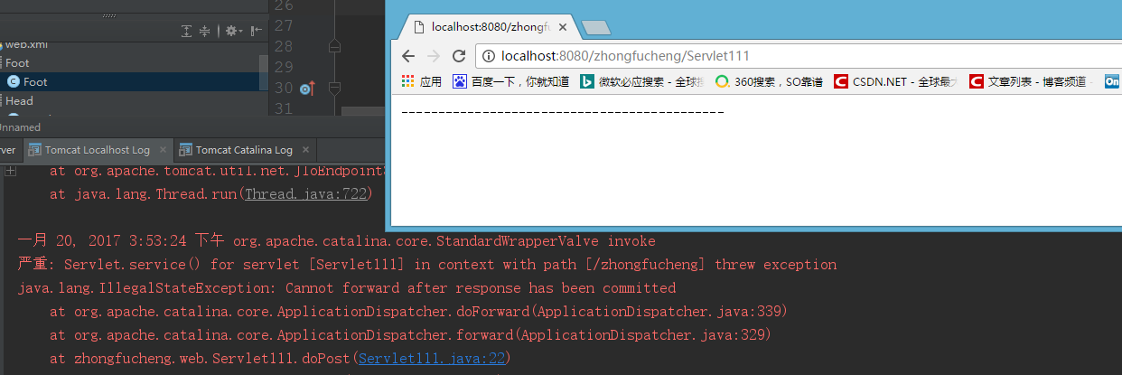 如果在调用forward方法之前,在Servlet程序中写入的部分内容已经被真正地传送到了客户端,forward方法将抛出IllegalStateException异常。 也就是说:不要在转发之前写数据给浏览器