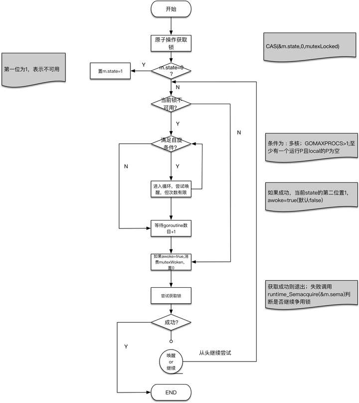 简单来说,如果当前goroutine可以加锁,那么调用原子操作使得mutex中的flag设置成已占用达到互斥;如果当前goroutine发现锁已被占用,那么会有条件的循环尝试获取锁,这里是不用信号量去对goroutine进行sleep和wake操作的(尽可能避免开销),如果循环尝试失败,则最后调用原子操作争抢一次,获取不到则还是得调用runtime_Semacquire去判断阻塞goroutine还是继续争用锁。