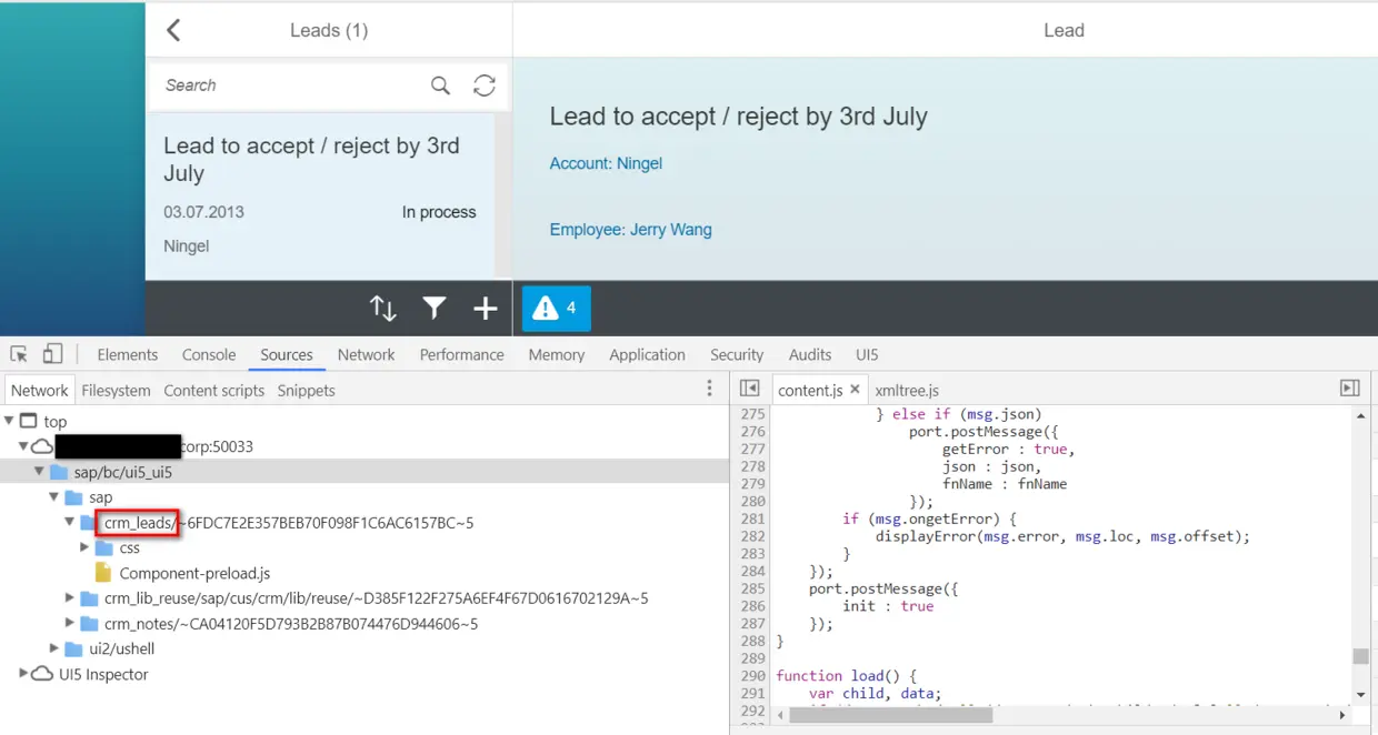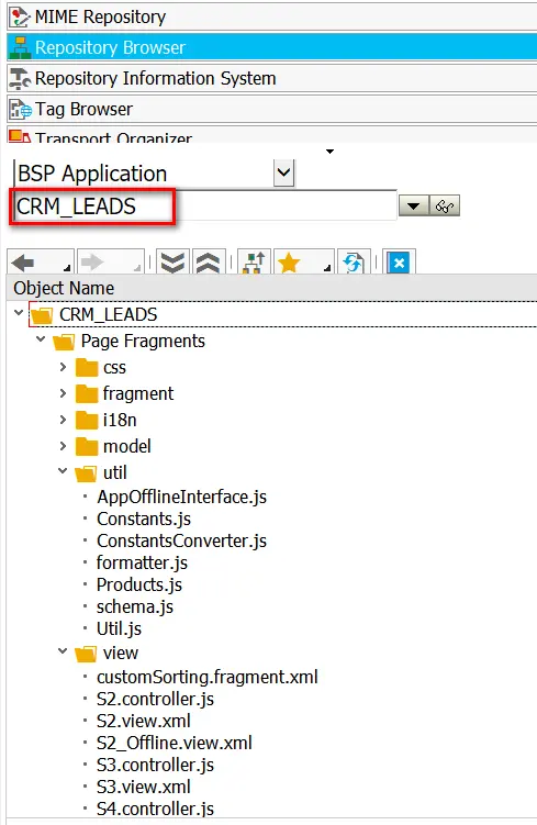 以CRM的My lead应用为例,在Chrome的development tool里能找到其对应的BSP应用名称为crm_leads,