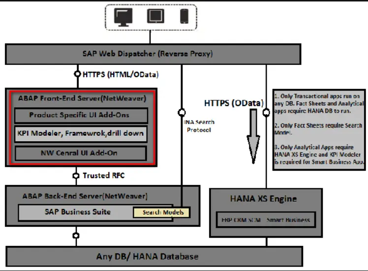 在Google上搜索关键字Fiori Architecture, 能找到这样一张图片,其中CRM和S/4 HANA的Fiori应用都以BSP应用的方式运行在下图我标注了红色方框的ABAP前台服务器上。