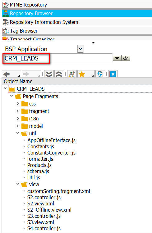 用SAPGUI登录这台前台服务器,使用事务码SE80即可打开该BSP应用,里面的层级结构和Chrome的development tool里观察到的一致(前提是您使用ctrl+alt+shift+p加载了调试版本的应用源码)