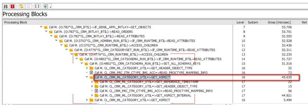 这是我很喜欢的一个强大功能,性能监控仅仅是其用途之一。本文介绍的另一个用途是当我拿到一个陌生的UI应用,无论是Fiori, C4C UI还是CRM WebClient UI,假设我需要知道一段操作后台执行了哪些ABAP代码, 但是我对这个应用的后台实现一点都不了解,无从下手。此时我可以用SAT跑一次UI应用,所以后台执行的代码被SAT忠实地记录了下来,非常方便我研究。下图是一个例子: