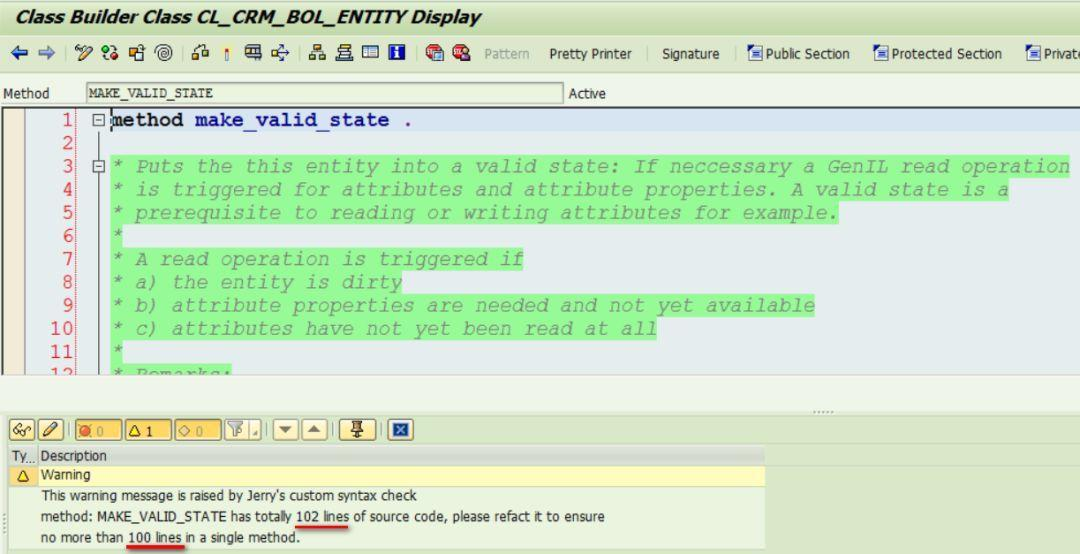 介绍如何增强SAPGUI的语法检查。我做了一个例子,强制要求每个类的方法源代码行数不得超过100行。当您点击SAPGUI语法检查的按钮或者快捷键Ctrl+F2时,一旦超过,会看到我自定义的错误消息: