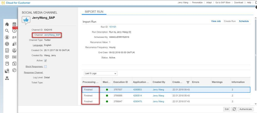 下图左边是我创建好的ID为I042416的社交媒体渠道,红色区域是我的Twitter账号。右边的IMPORT RUN包含了一个表格,显示了三次后台作业的执行情况。这些后台作业完成的逻辑就是把JerryWang_SAP这个账号在Twitter网站上发布的tweets抓取到C4C去。