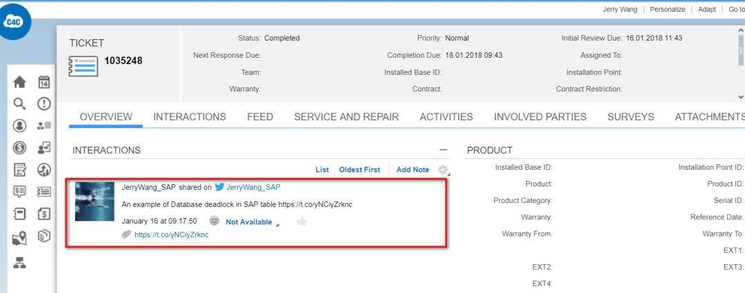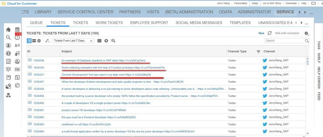 这三条tweets都成功地被抓取到C4C系统的Service(服务)工作中心,生成对应的Ticket:
