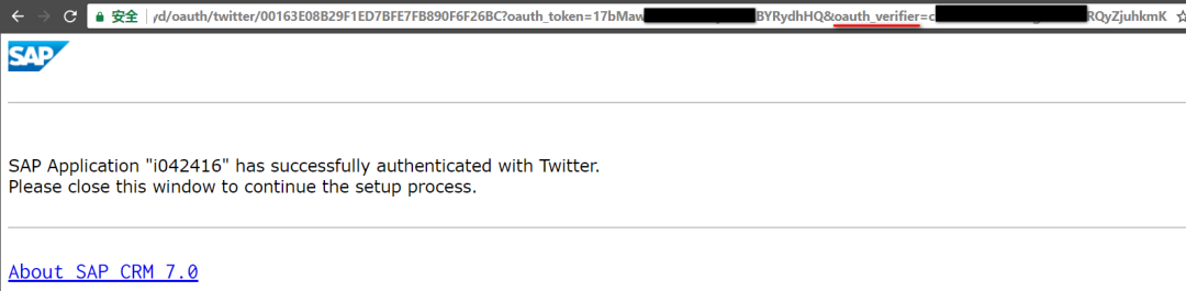 您点击了button之后,Twitter就会返回给我一个access token。利用这个access token,我就可以开工了,在CRM ABAP代码里调用Twitter API,读取您的tweets。