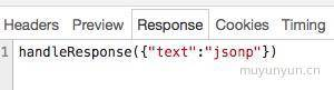 可以很鲜明地发现在 Request URL 中有一句 ?callback=handleResponse,这个 callback 后面跟着的 handleResponse 即回调函数名(可以任意取),服务端会接收到这个参数然后拼接成形如 handleResponse(JSON) 的形式返还给前端(这也是 JSONP == JSON with padding 的原因吧),如下图,这时候浏览器就会自动调用我们事先定义好的 handleResponse 函数。