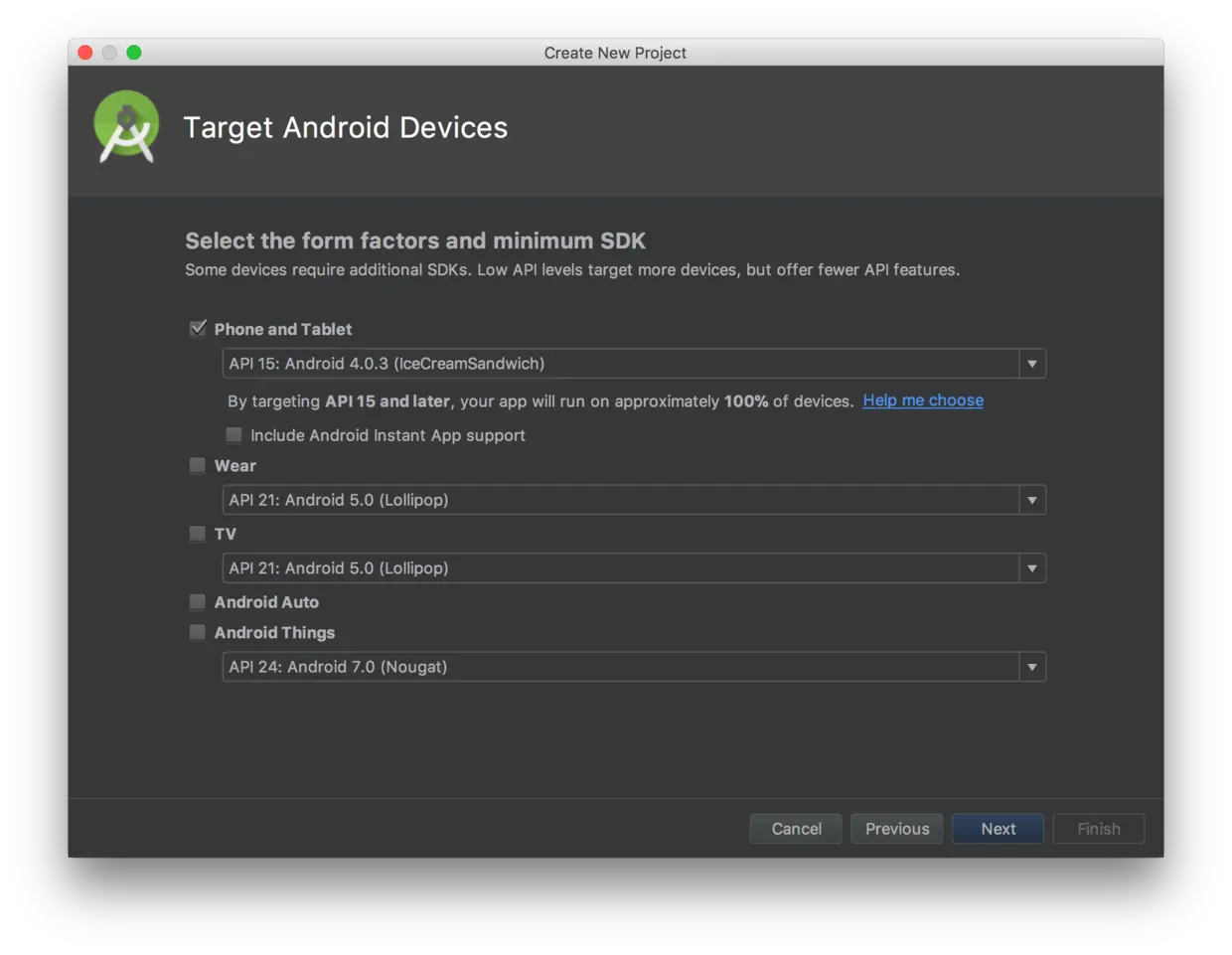 (1)App 运行设备可选择手机和平板 (Phone and Tablet)、可穿戴设备 (Wear)、电视 (TV)、汽车 (Android Auto)、物联网设备 (Android Things)。