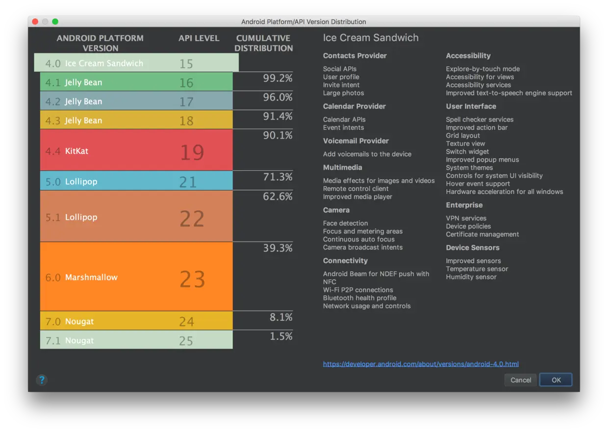 (2)最低 SDK 版本 (Minimum SDK) 可点击 "Help me choose" 帮助选择。例如选择 "API 15: Android 4.0.3 (IceCreamSandwich)" 后,左侧可见目前已支持所有 Android 设备,右侧列出支持的特性,如下图所示。
