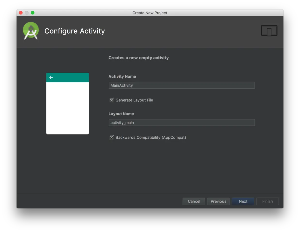 工程由许多不同类型的文件组成,如图片文件、声音文件、XML 文件、Java 文件等,可以根据 App 需求将他们的名称进行修改,此处保持默认。最后点击 Finish 完成。