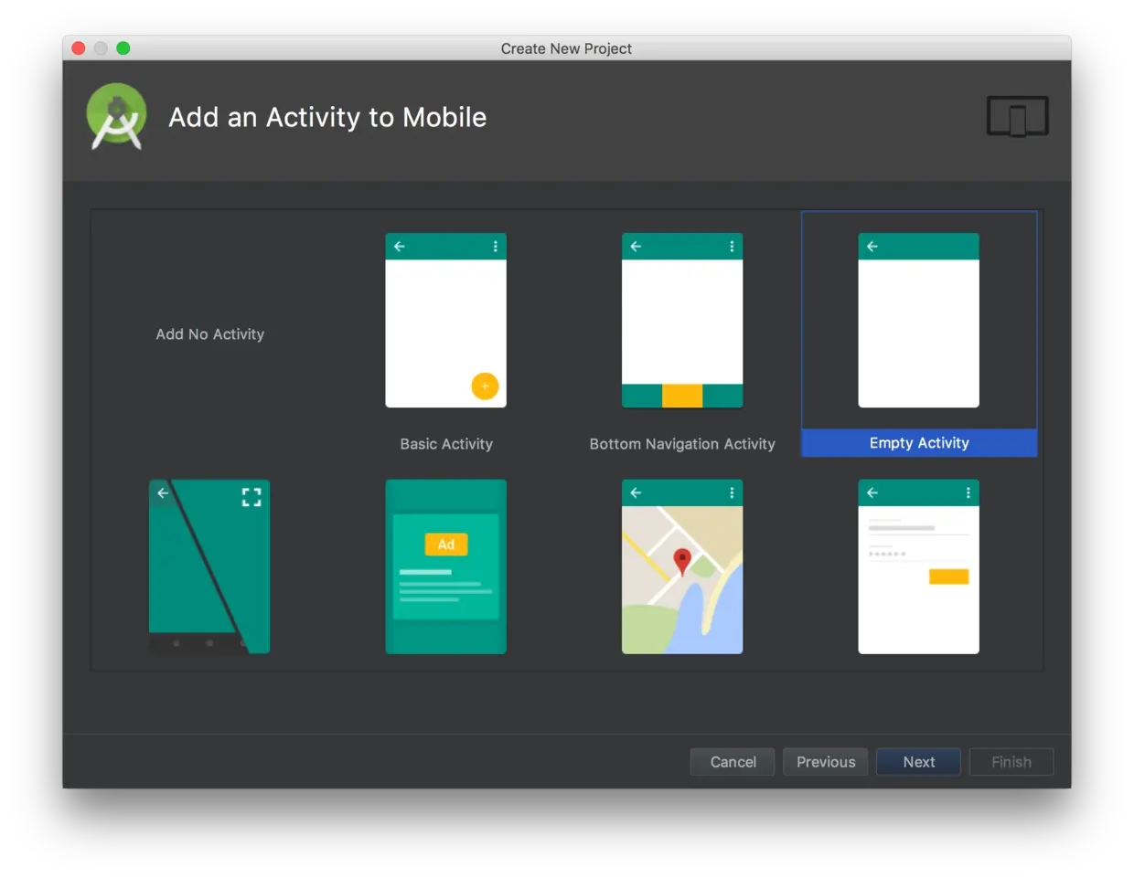 Android Studio 提供了许多工程模板让开发者能够在模板的基础上进行开发,此处选择 Empty Activity。
