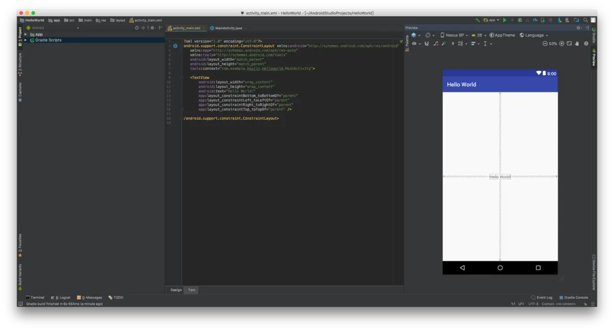 到此为止,第一个 Android App 就完成了。从 Android Studio 右侧的 Preview 标签可以看到 App 会显示 "Hello World!" 字样,现在安装到实际的 Android 设备验证。