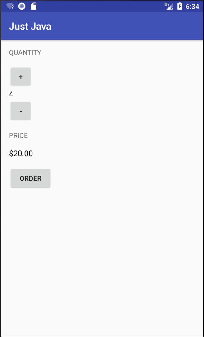 目前 Just Java App 实现了增加和减少数量,以及显示价格的功能,如下图。