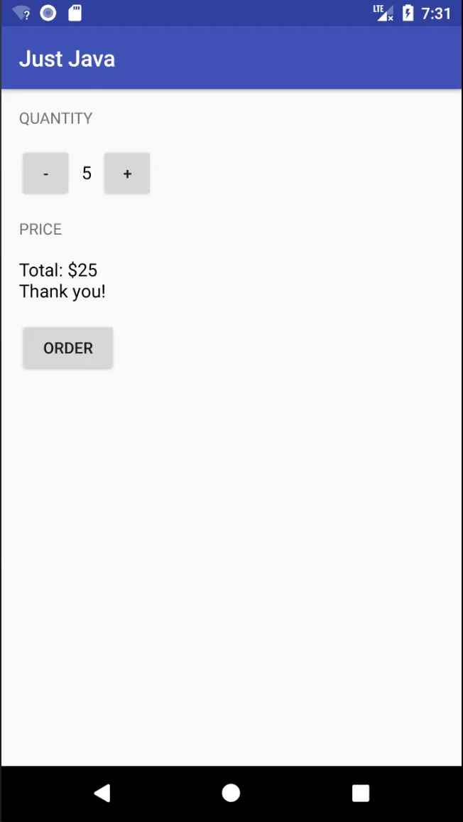 添加了一个 displayMessage method,使点击 ORDER 按钮显示的内容更多了。另外修改了 XML 代码,使控制数量的按钮布局改变了。效果如下图。