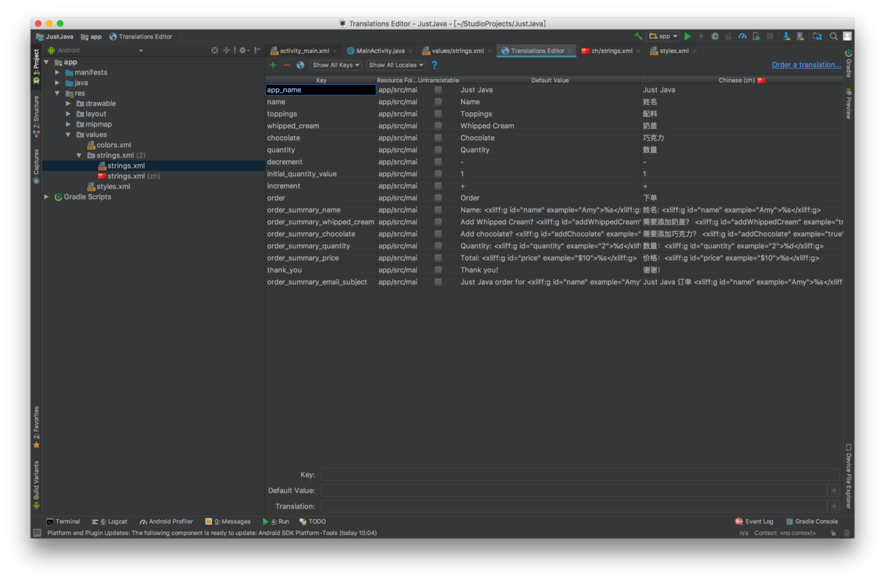 Intent 的内容会在接下来课程中详细介绍。至此 Just Java App 的开发就告一段落了,现阶段这个咖啡订购 App 实现的功能有