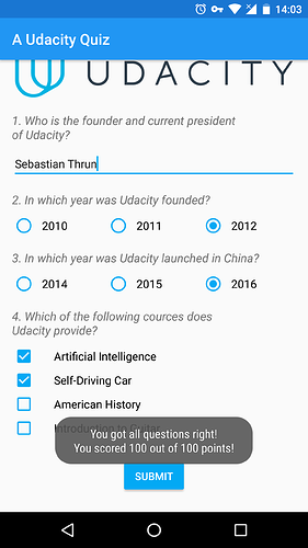 第一部分《布局和交互》的课程完成了,同时也迎来了入门课程的第三个实战项目:AUdacityQuiz 小测验应用,它应用了除 Intent 外已学的所有知识点,