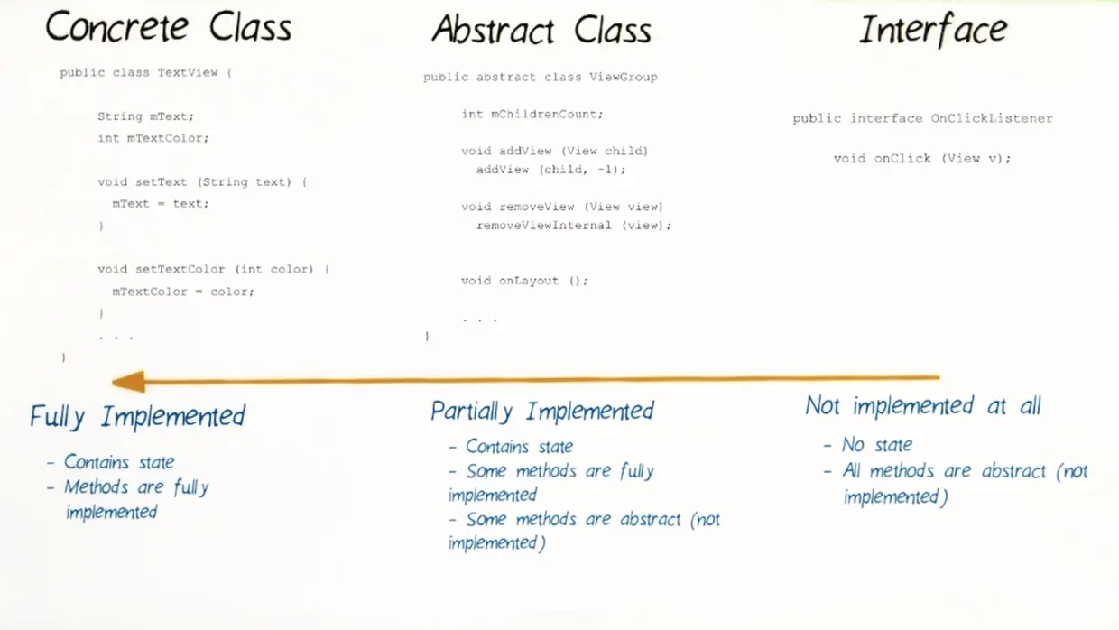 首先来看 Event Listeners 作为一种 Interface(接口)的定义:接口只有 Abstract methods(抽象 method,指定返回值、名称、输入参数,分号结束,大括号中间的代码实现由开发者自由发挥的 method)。类似的,还有 Abstract Class(抽象类:部分实现的类,包括状态 state,一些完全实现的 method,一些抽象 method)。如下图所示,从 methods 实现程度来看,“完全实现的类”到“抽象类”再到“接口”是一个连续过程,像 TextView 这种完全实现的类,Android 设计成完全的标准化;到 ViewGroups 这种抽象类,包含了 TextView 等标准化的类,也包含 LinearLayout 等子类是抽象的;再到 onClickListener 这种接口,只规范了抽象的 method,具体实现是开放的(回调函数)。