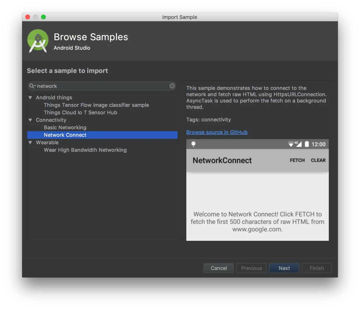 3. 在 Android Studio 中选择 File > New > Import Sample...,在弹出的对话框搜索关键字,可以导入 Google 提供的示例应用。例如搜索 Network 可以找到 Network Connect App,它使用了 HttpsURLConnection 进行网络操作,AsyncTask 作为 Activity 的内部类,实现从 google.com 获取前 500 个 HTML 响应字符的功能。