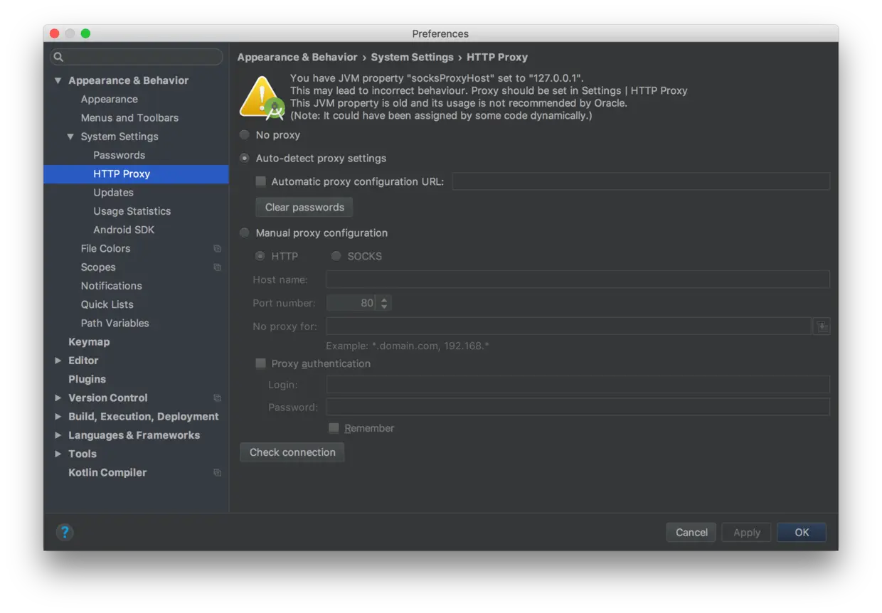 如果遇到无法下载示例目录的情况 (Failed to download samples index, please check your connection and try again),检查 Android Studio 中 Preference 的 HTTP Proxy 选项是否选中 Auto-detect proxy settings。选中此选项可以让 Android Studio 通过系统代理科学上网。如果仍无法解决问题,所有示例应用也可以在 Android Developers 网站 中找到。