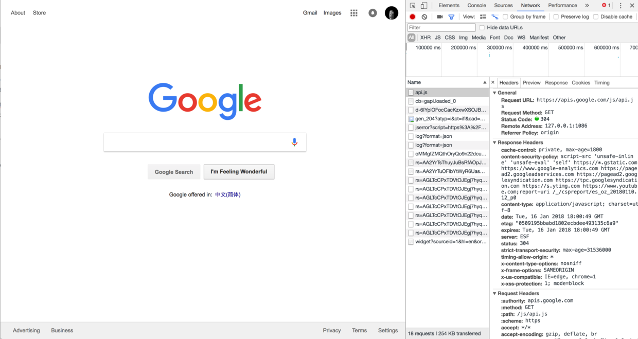 网络是计算机(包括手机、笔记本电脑、服务器等)之间交换信息的概念,它的基本原理是一台计算机向另一台计算机发送 HTTP 请求,发送端通常称为客户端,接收端为 Web 服务器;服务器作出响应后,客户端能够获取响应并从中提取信息。例如使用浏览器打开 Google 搜索主页时,浏览器作为客户端向 Google 服务器发送 HTTP 请求,浏览器接收到 Google 服务器的响应后解析数据,最后刷新页面显示一个完整的网页。利用 Chrome 浏览器的开发者工具(在空白处右键选择 Inspect),在 Network 界面可以看到浏览器已加载的资源 (HTML, CSS, JavaScript),选中其中一项,在 Headers 标签页下可以看到浏览器向 Google 服务器发送的请求的相关信息,如 URL、method、响应代码等。