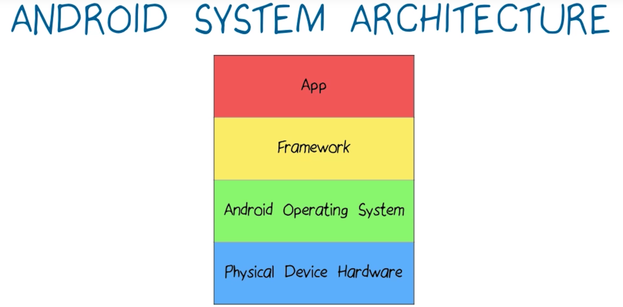 - 顶层是应用层,开发者写的所有应用程序都在这一层。App 通过调用下一层的 Android Framework class,如 TextView、Activity,使应用仅用几行代码就完成很多复杂的工作,如显示文本、打开一个新页面。