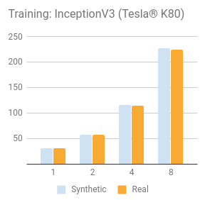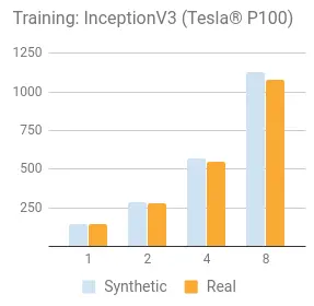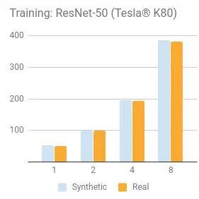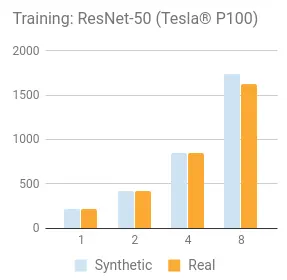 对合成数据的测试是通过使用一个 tf.Variable 设置相同的 shape,除了每个 ImageNet 模型。我们认为,当评估一个平台的基准时包含真实数据是很重要的。底层硬件和框架的加载测试是为了训练实际数据。我们开始合成数据用来移除磁盘 I/O 作为一个变量,并设置一个基准。然后使用真实的数据来验证 TensorFlow 的输入和底层磁盘 I/O 的计算单元。