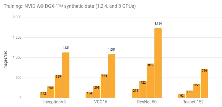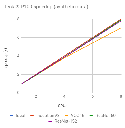 InceptionV3 (arXiv:1512.00567), ResNet-50 (arXiv:1512.03385), ResNet-152 (arXiv:1512.03385), VGG16 (arXiv:1409.1556), 和 AlexNet 使用 ImageNet 数据集测试。这些测试运行在 Google 计算云引擎,亚马逊计算云 (Amazon EC2) 和 NVIDIA® DGX-1™ 。大部分测试使用合成和真实的数据。
