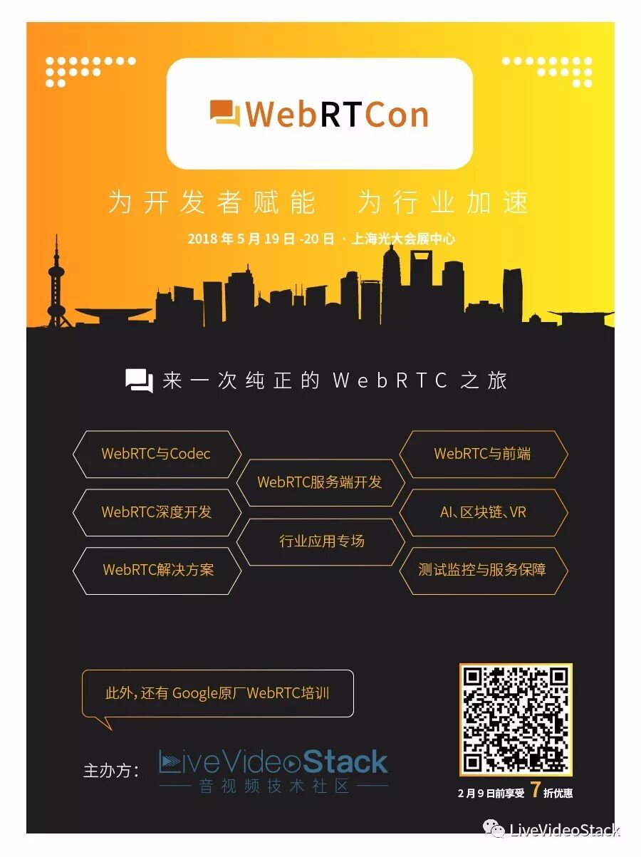 最后提醒,2月9日前购买WebRTCon 2018门票将享受7折优惠,点击访问报名页面。