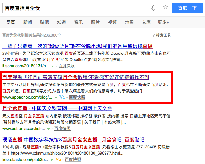 每一个公司面对热点都不会免俗,蹭热点是一件无关道义的正常运营手段。但是我们对待热点的态度是冷静分析背后的原因,挖掘真正对用户有价值的信息。前几日,我司(注:吆喝科技)内容运营的一个小想法一不小心将“月全食直播”这一热搜的百度搜索排名第二名给抢到了——没有渠道,没有宣传,之所以第二都能这么开心是因为百度官方和数字科技馆官方直播链接都被这篇文章挤到了后面。有图有真相: