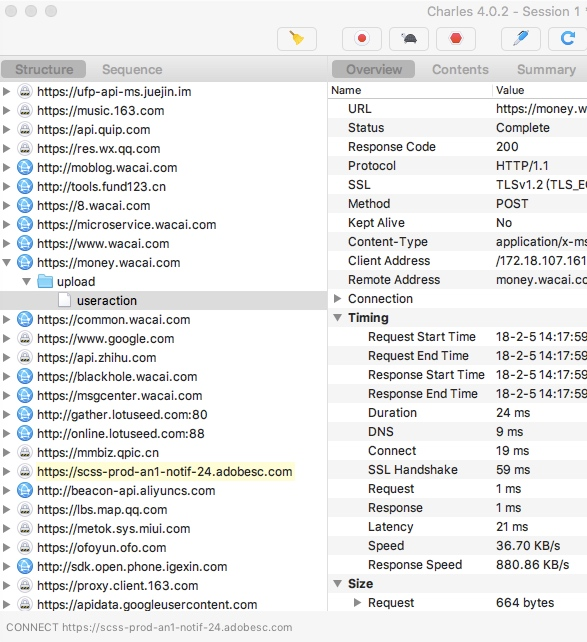 - 随便打开一个App,比如小米系统浏览器,肯定有一堆请求,盯着Charles的请求监控面板,可以看到有很多的请求,随便选择一个https请求,可以看到,https请求已经可以抓包了