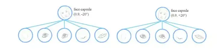 类似CNN的深层网络,胶囊网络也可以有层次结构,如下图所示,红色的是底层的胶囊结构,绿色的是高层的胶囊结构,绿色的胶囊无法知道图形中具体的形状是什么在哪里,这使得绿色的胶囊结构通过训练所学到的只是图形中子结构之间的相互关系,这就实现了CNN所不能的,也就是将图像在其头脑中进行翻转伸张平移等视角变换,但同时保持其特征的一致性。