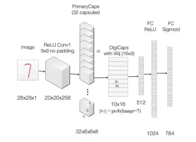 由于每个胶囊给出的是输出是一组向量,不是如同传统的人工神经元是一个单独的数值(权重),为了解决这组向量向那一个更高层的神经元传输的问题,就需要Dynamic Routing的机制,而这是胶囊神经网络的一大创新点,也是理解中的难点。Dynamic routing使得胶囊神经网络可以识别图形中的多个图形,这一点也是CNN所不能的。由于讲解Dynamic routing需要很多数学细节,这里就不再细说。可以理解成一种实时的投票,决定不同胶囊网络之间提取的特征哪一个更显著,更有益于上一层网络的重构。