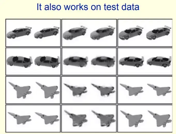 下面展示了胶囊神经网络在3D图像中的表现,这里的目标是看看胶囊神经网络能否正确的的从下图中左边的一列,将图形做选择,得出右图的图形。我们看到,胶囊网络翻转生成的图像效果不错。这说明神经网络学到了每个图形中子结构之间应该怎样连接。而在第二幅图中,展示了说学到的连接也可以应用在没有出现在训练集的测试数据上,哪怕训练数据是汽车,测试数据是飞机,这展示了胶囊网络优良的可扩展性。