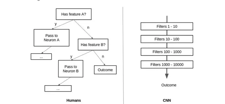 人类在识别图像的时候,是遵照树形的方式,由上而下展开式的,而CNN则是通过一层层的过滤,将信息一步步由下而上的进行抽象。这是Hinton认为的人与CNN神经网络的最大区别。